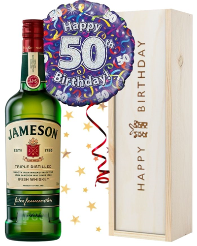Complete with a single bottle of Jameson Triple Distilled Irish Whiskey and a festive 50th birthday pre-inflated helium balloon; from front to back this amazingly sleek and sturdy gift set offers class, sophistication, and full flavours as well, beginning to end. Featuring the words Happy Birthday printed clearly on top and simple to customise with a personal message from you if desired, this 50th Birthday Irish Whiskey and Balloon Gift Box provides the perfect way to send your warmest birthday wishes no matter how near or far away you may be. Presented in a solid wooden gift box lined with wood wool throughout the inside, this beautiful birthday gift is designed to withstand delivery to any location required, any day of the year.